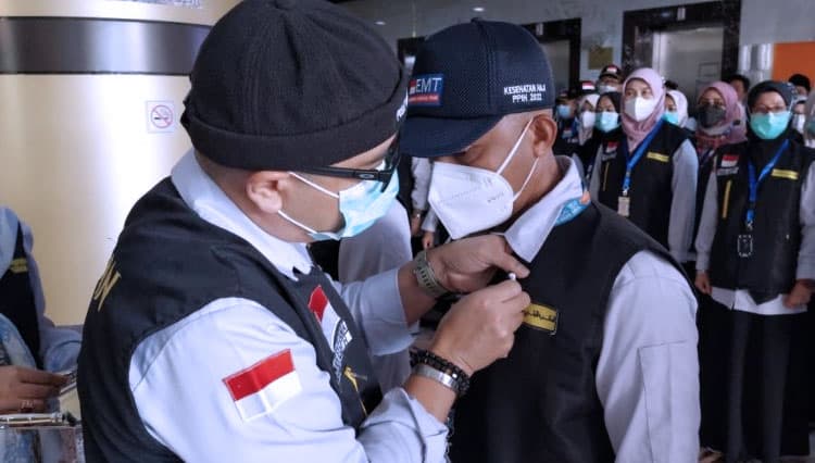 TIMES Situbondo/Kapuskes Haji Kemenkes Budi Sylvana saat menyematkan pin kepada petugas kesehatan haji. (FOTO: dok. Kemenkes)